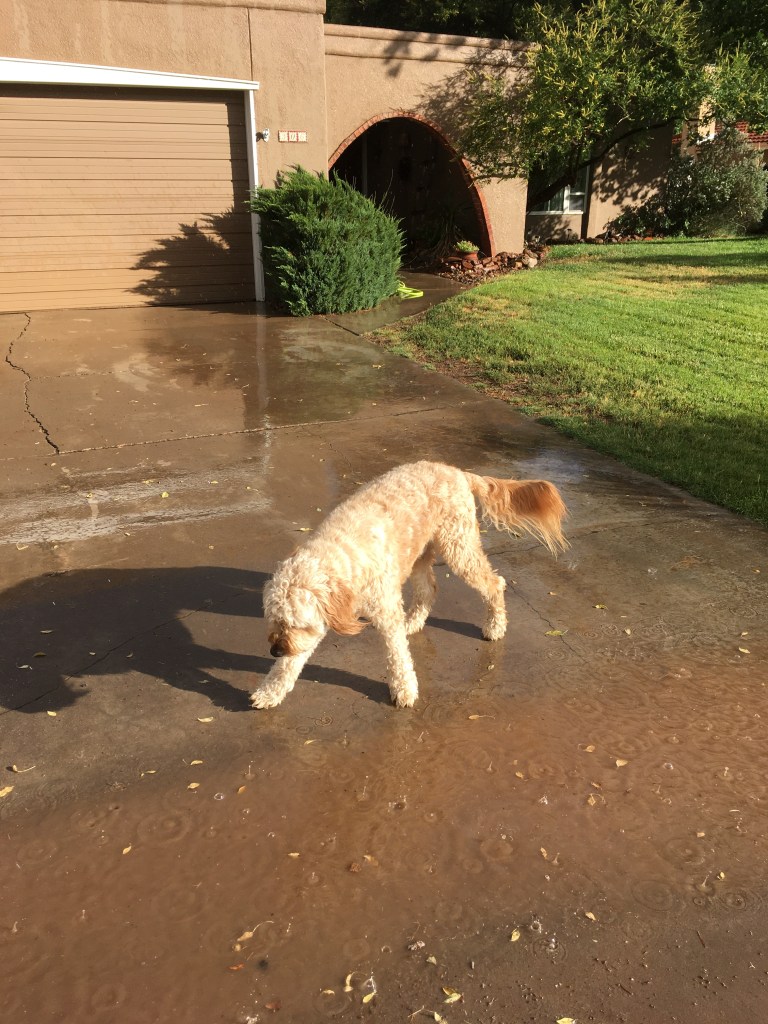 Out our front window, during the storm, I could see a gaggle of kids and one adult (and just one umbrella) splashing around in puddles in the street that the rain had left. When we get only an average of seven and one-half inches of rain a year, every drop is precious and appreciated. Let’s hope St. Swithin’s forecasting legend is accurate.