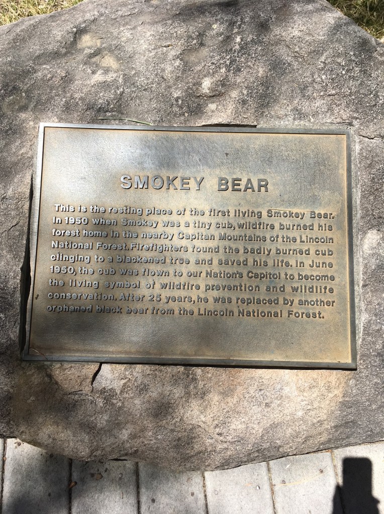 Smokey is buried in Capitan at the Smokey Bear Historical Park after living many years in the National Zoo in Washington. I’ve attached a photo of his burial plaque and a link to the park if you’re interested. We visited the park a couple of years ago with good friends, and it’s worth the trip.