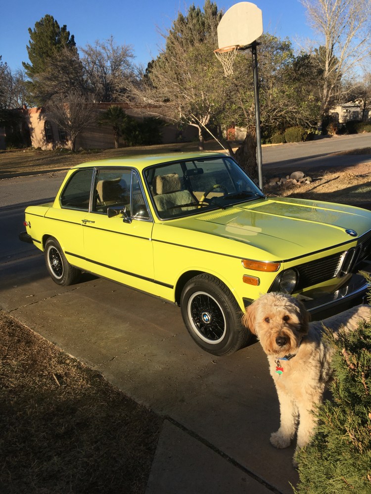 Chester, looking quizzical next to our classic 1975 BMW 2002