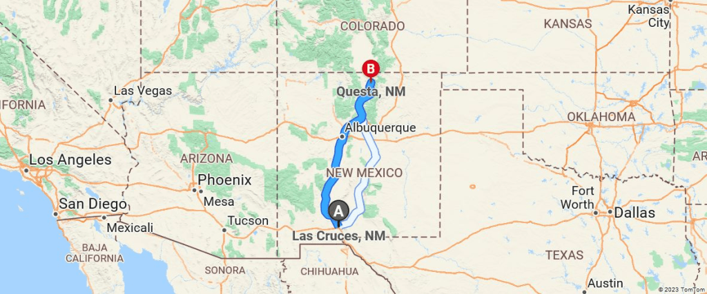 I looked up the driving distance and time between here Questa and found that it could be up to five hours and 42 minutes, depending on traffic to cover the 277 miles. That doesn’t include stops for gas, snacks and to use the restroom.