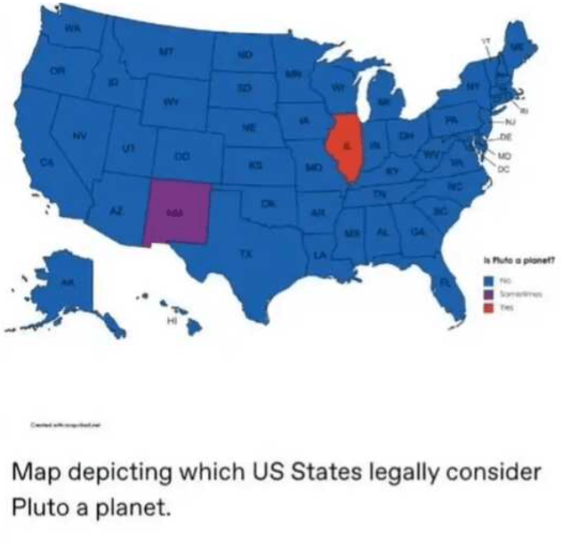 Yes, that’s New Mexico highlighted in purple, which still strongly believes that Pluto is a real planet. I have no idea why Illinois is conflicted about the issue when the rest of the 48 states appear to have gotten over the demotion of New Mexico’s favorite celestial body. And I have no idea where the map above originated and how that information was gathered. I do suspect that it is correct, however, knowing how passionate we New Mexicans seem to get over such seemingly esoteric things as: