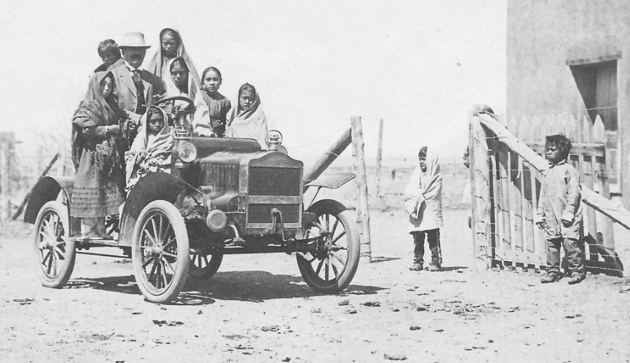 Martin is said to have brought the vehicle to Taos in 1900. There are no know photographs of that vehicle but below is a picture from a few years later with a newer car, loaded with members of the Taos Pueblo.